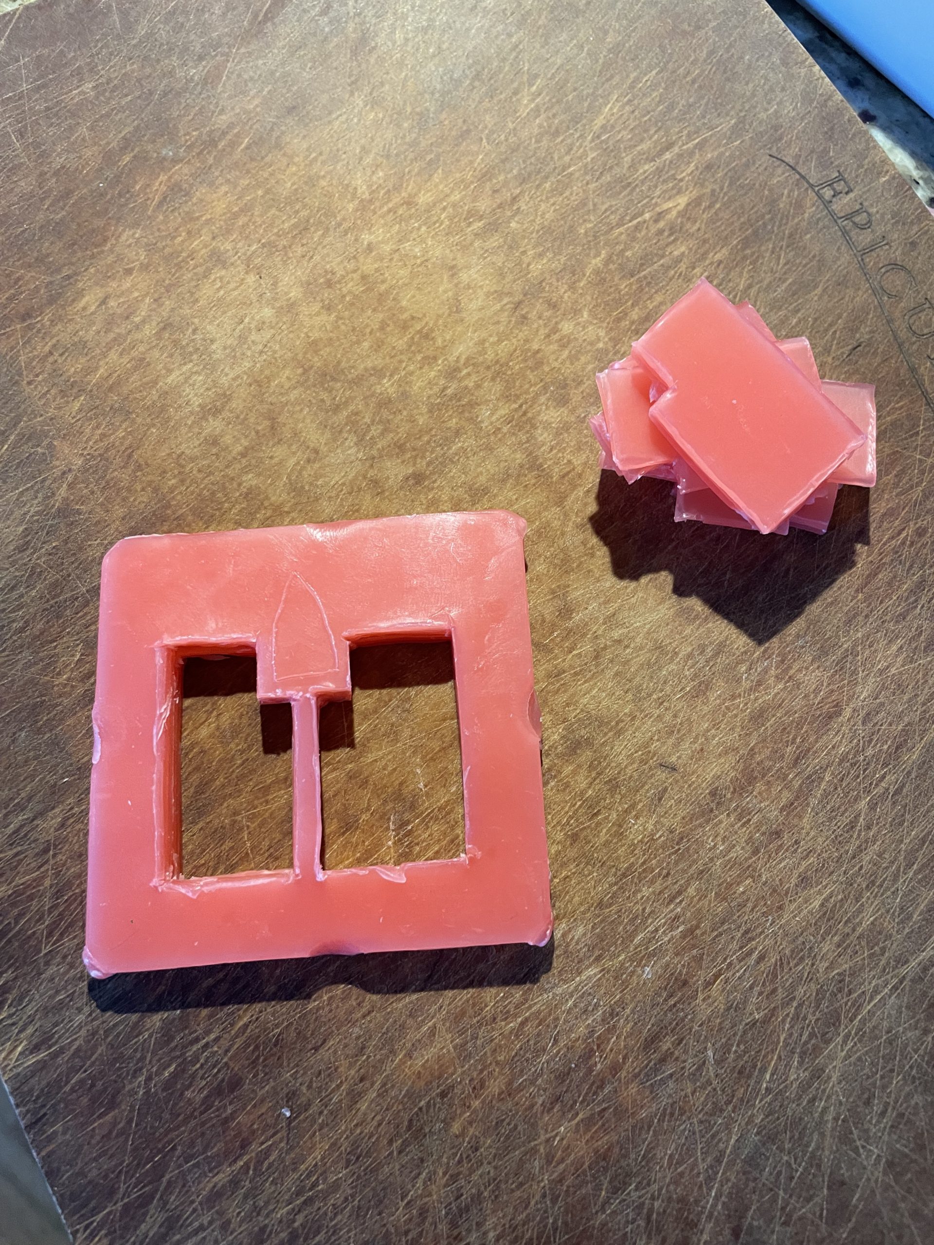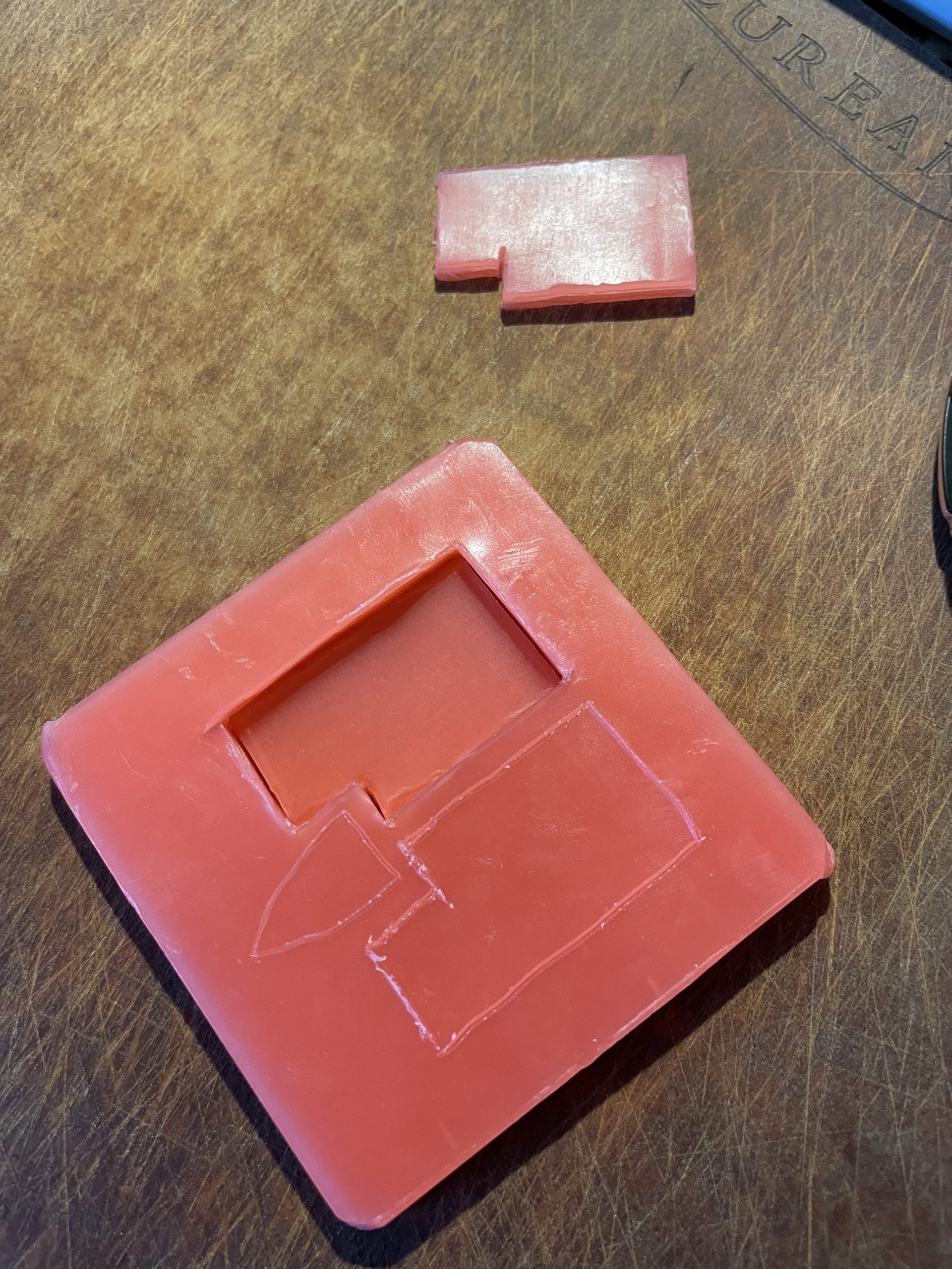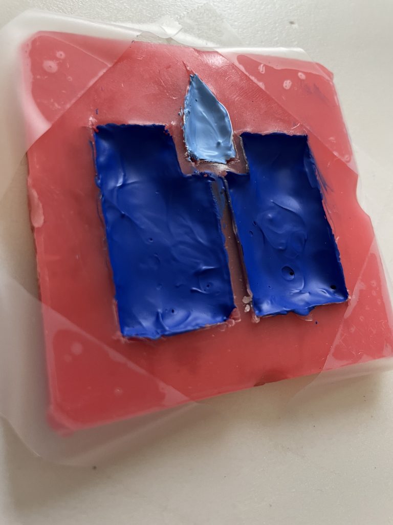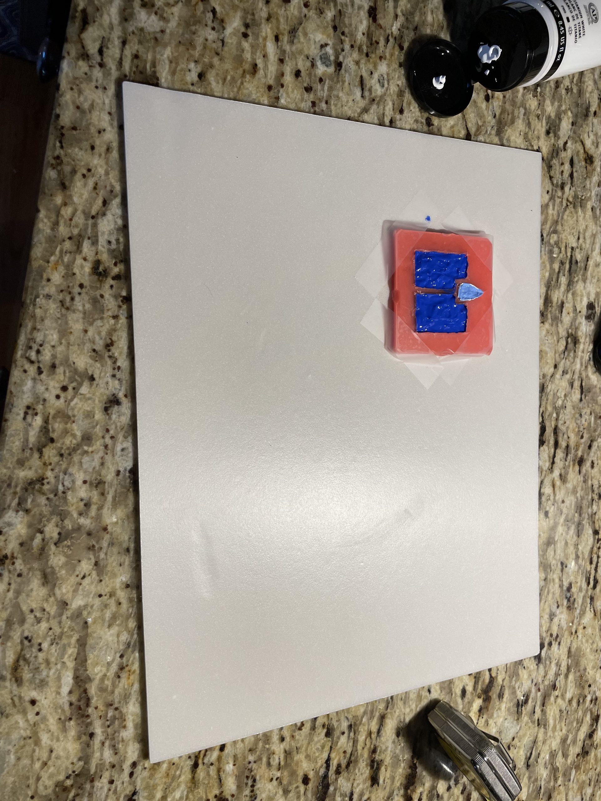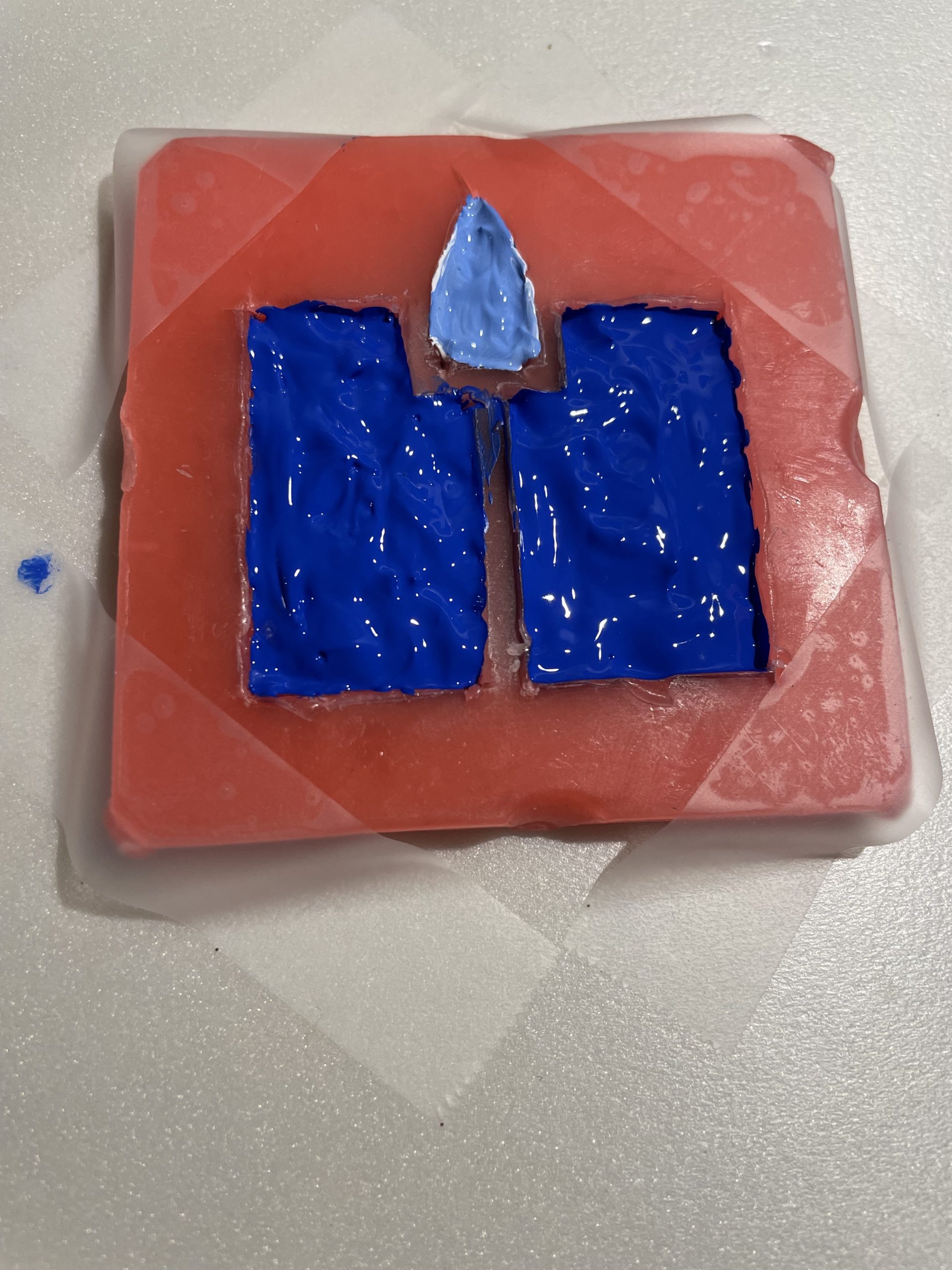 Tried using 6 stacked 1mm sheets of dental wax to make a “paint mold”. Wax worked much better even though it was harder to work with and cut. The acrylic paint was still too thin and takes too many layers to make even the thinnest raised shape. At least 3-4 layers with at least a week of drying time apiece.
