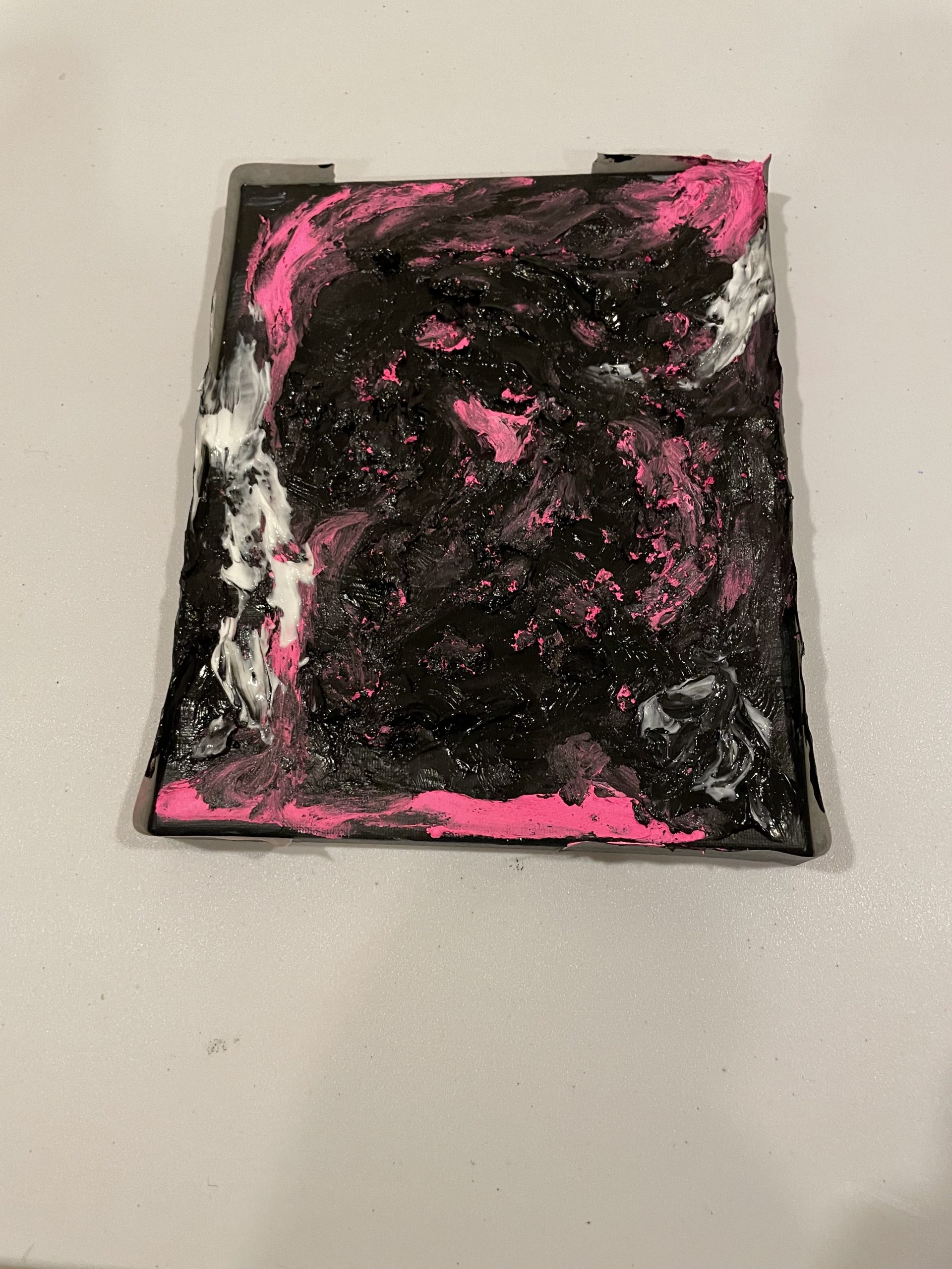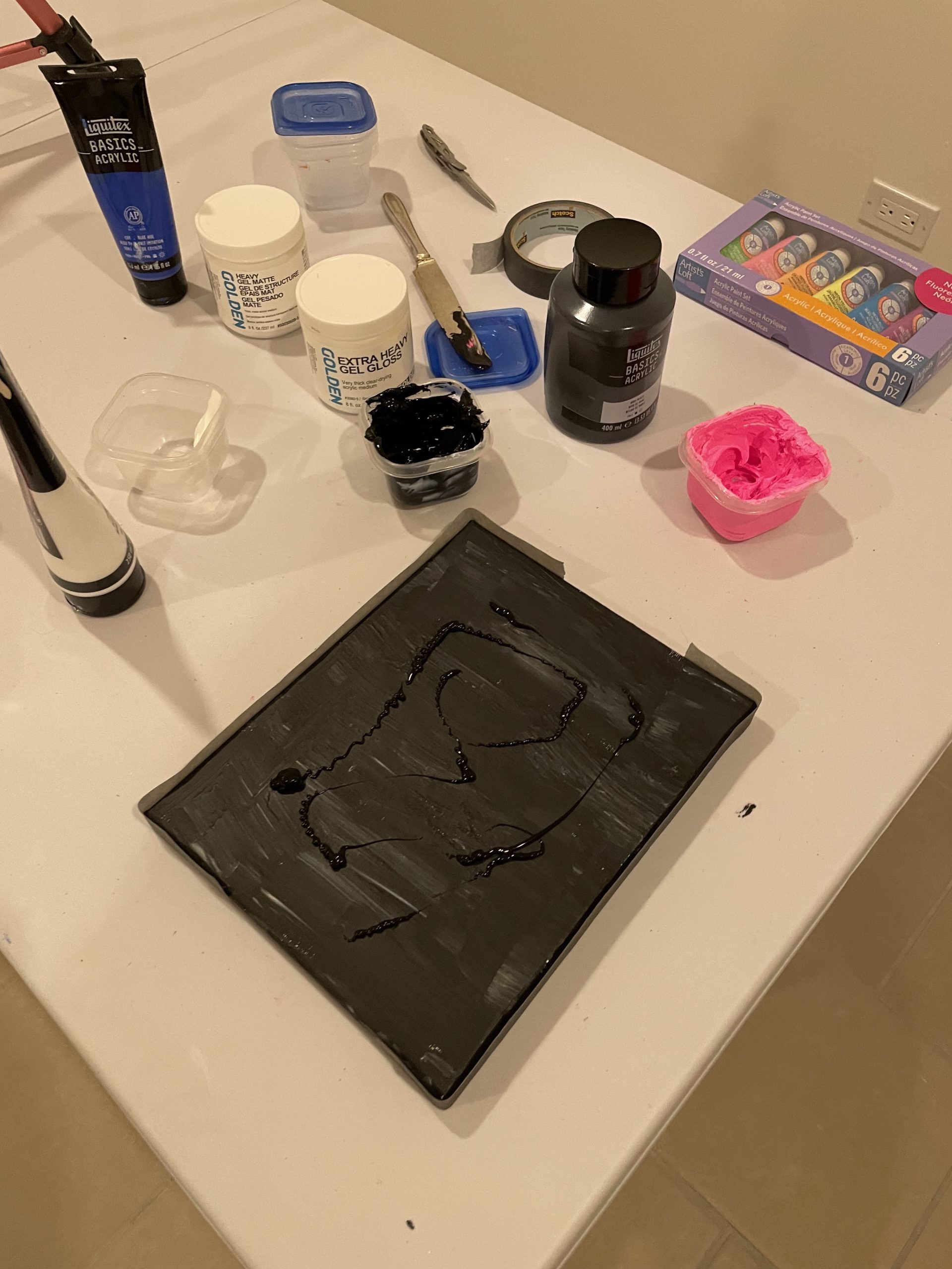 Right away I made some mistakes. I was using extra heavy matte gel and I used WAY TOO MUCH “the pinkest pink” pigment and not enough white acrylic paint. I used so much that the resulting mixture was kind of hard and gritty and hard to manipulate. I used extra heavy gloss gel on the pink but only heavy matte gel on the black paint, so the black paint was MUCH more malleable. I found it was just immediately coating the pink and getting on every surface covering everything including my hands. It looked like a giant black mess, and I realized right away I’d made a serious mistake.