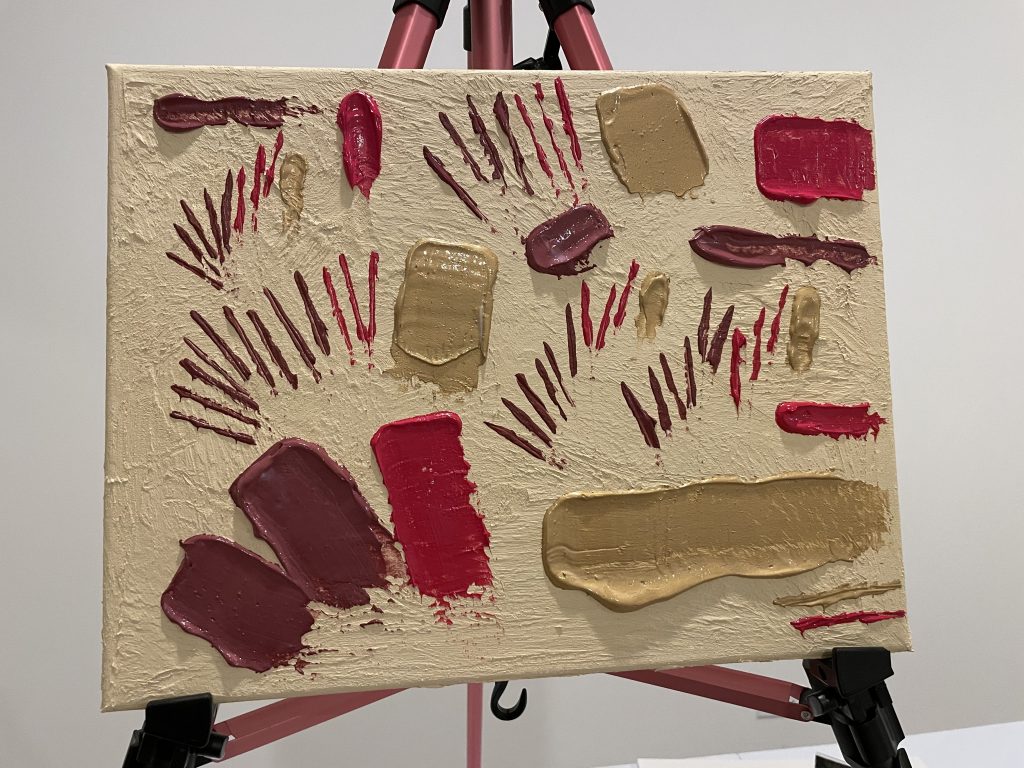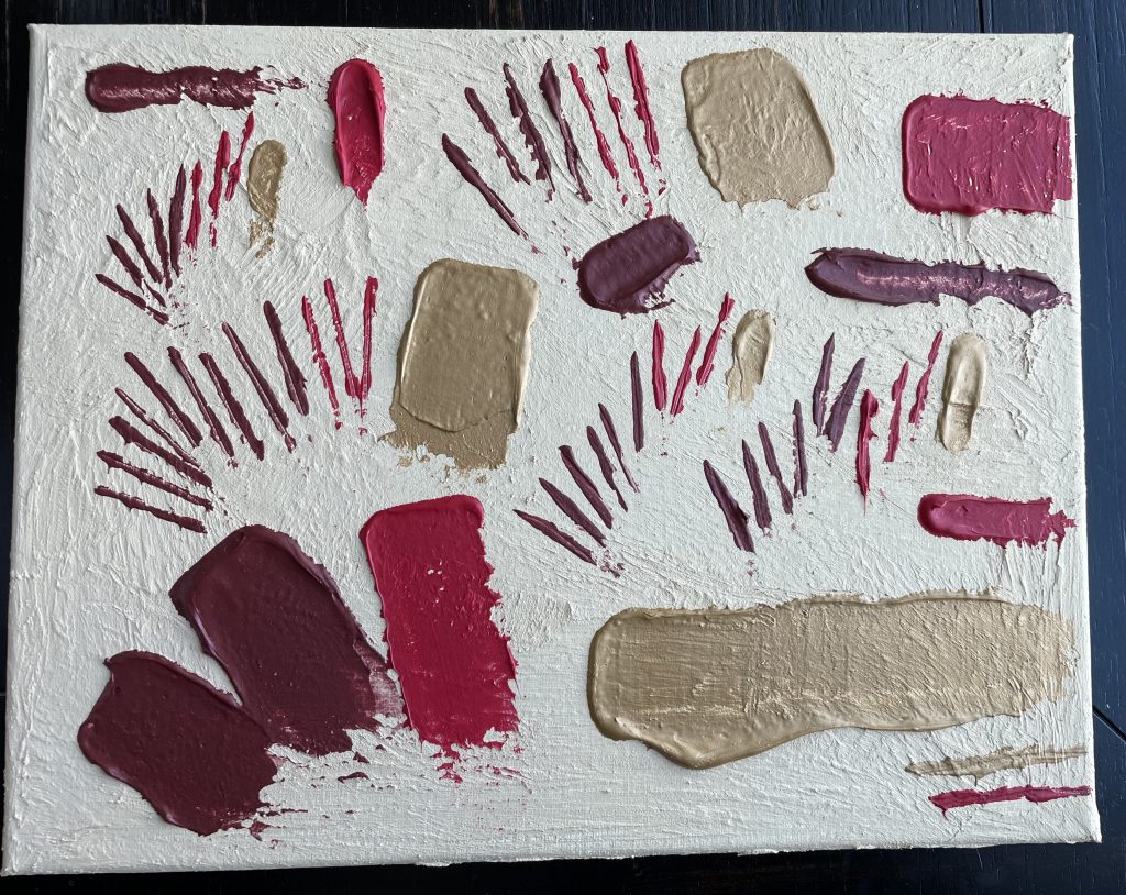 I had the idea to do little radiating tick marks like the sun… dark red, red, gold, with just enough heavy matte gel to make it stand out. But the tick marks just weren’t bold enough so I just dropped some big slabs with big palette knives.