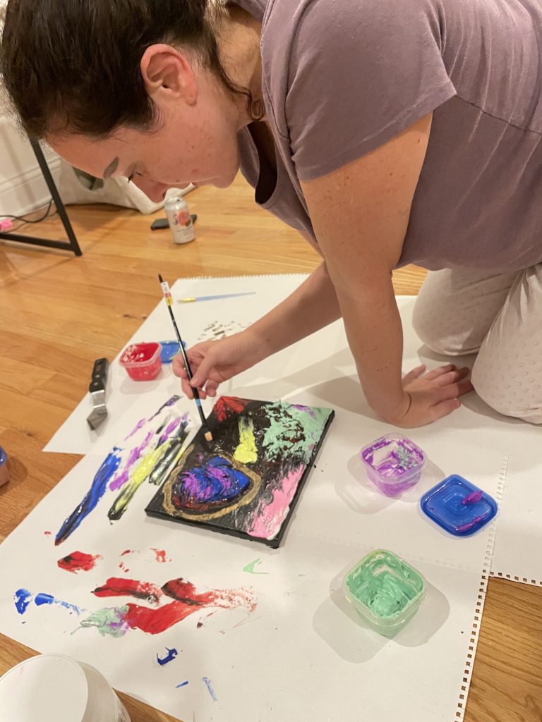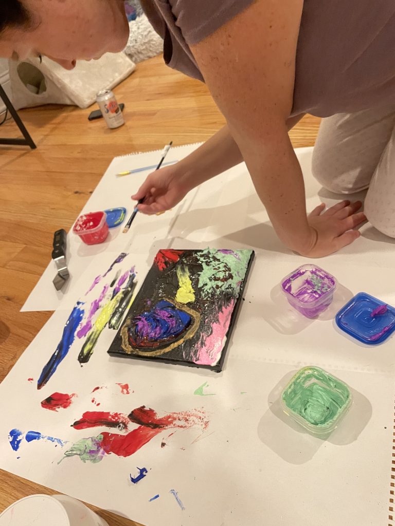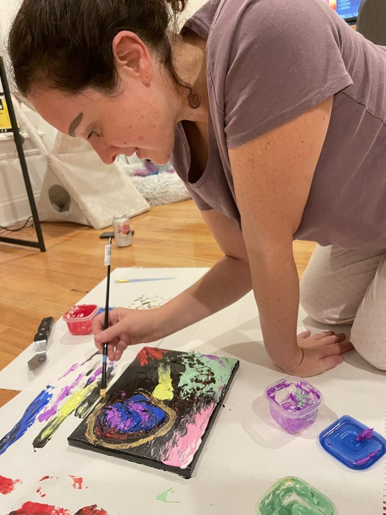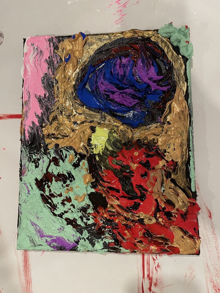 My sister and I had been wanting to do a collaborative painting since I’ve been painting and we finally got the chance when we visited recently. I wanted to show her the fun of painting impasto with thick gel media. We took turns applying color in big chunky patterns in a “yes and…” approach. The title refers to how much the big blue and purple shape looks like an alien heart.
