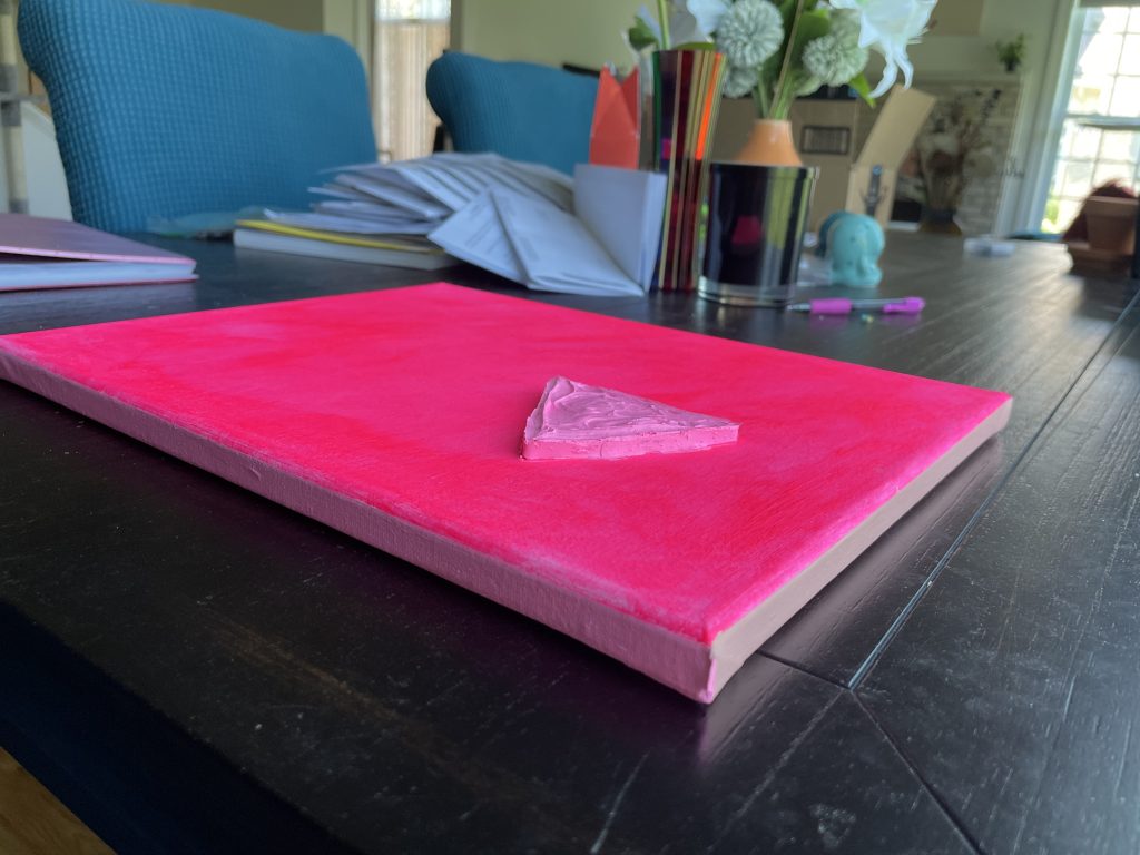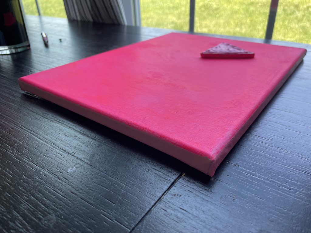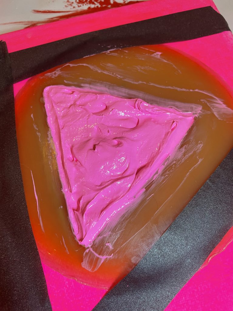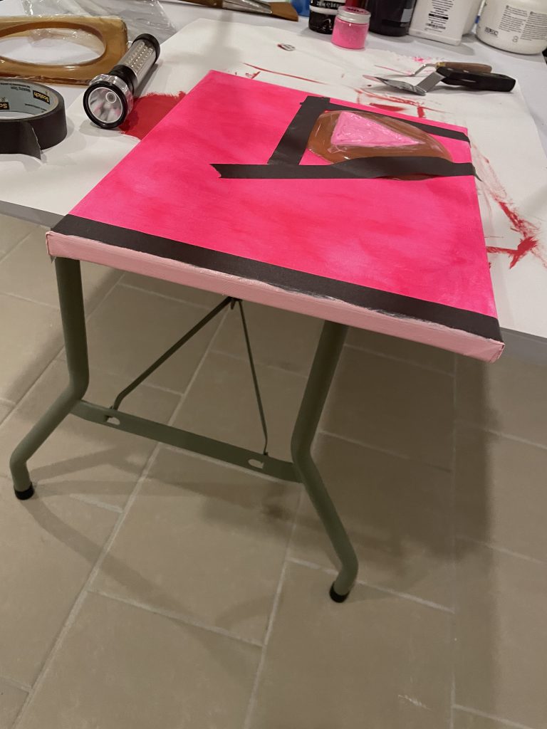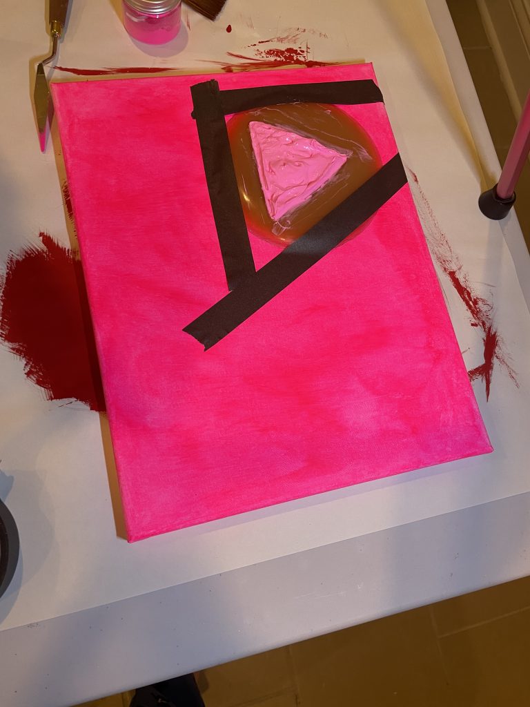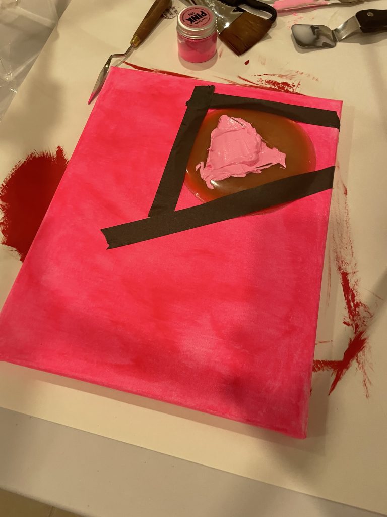 I ended up putting a heavy jar of gel medium on top to press it into the canvas which transferred ink from the bottom of the jar onto the painting. I hastily mixed a pink and painted over the top of the shape, which made it a little less glossy but in general pretty cool.