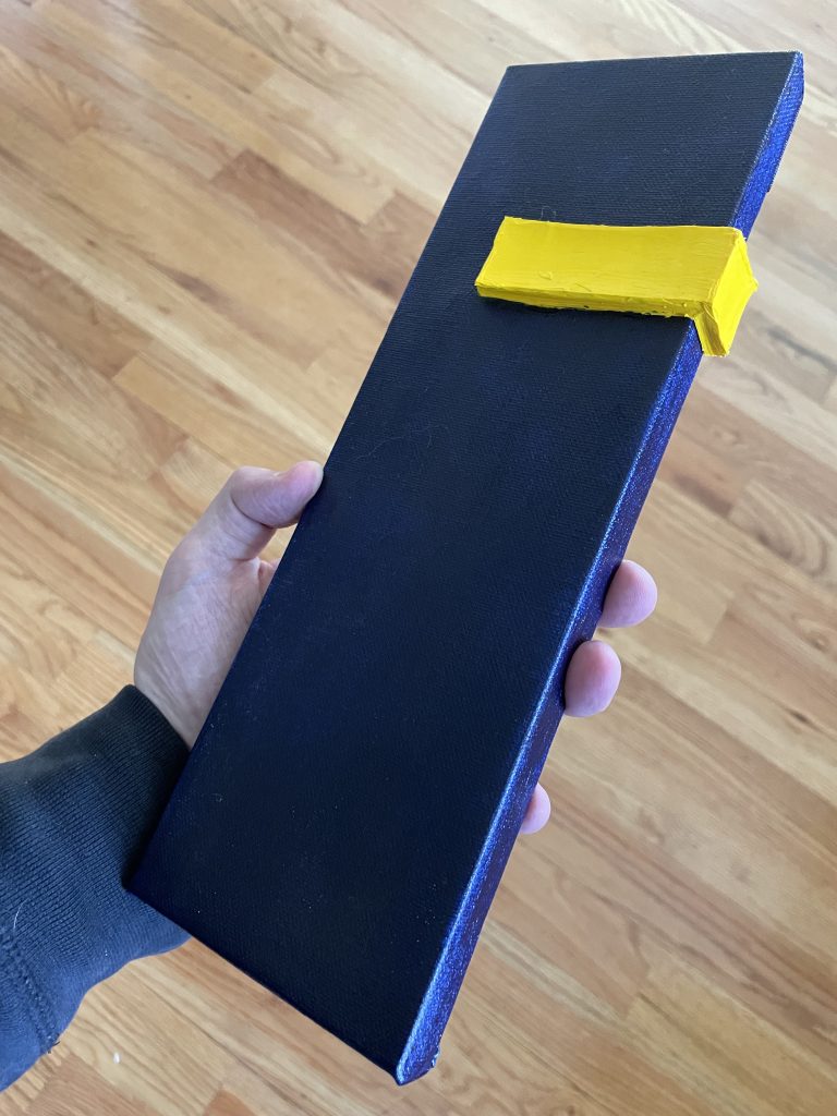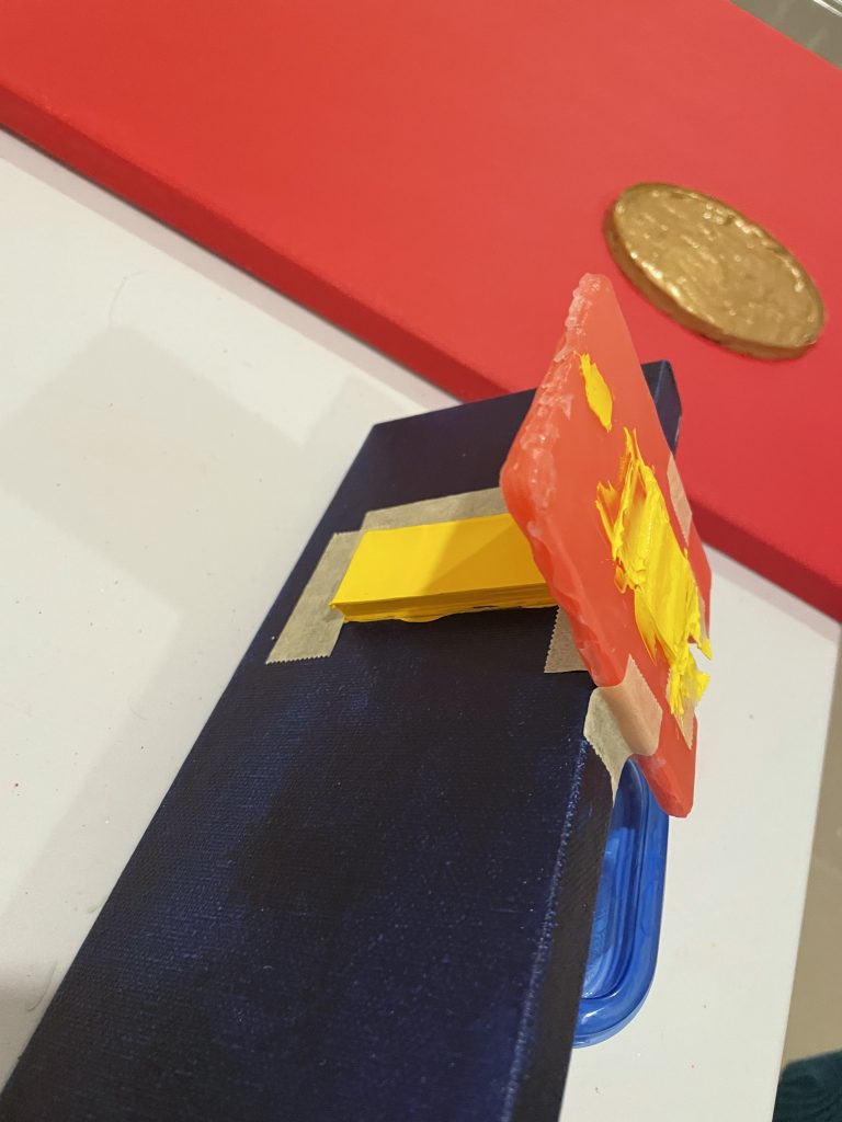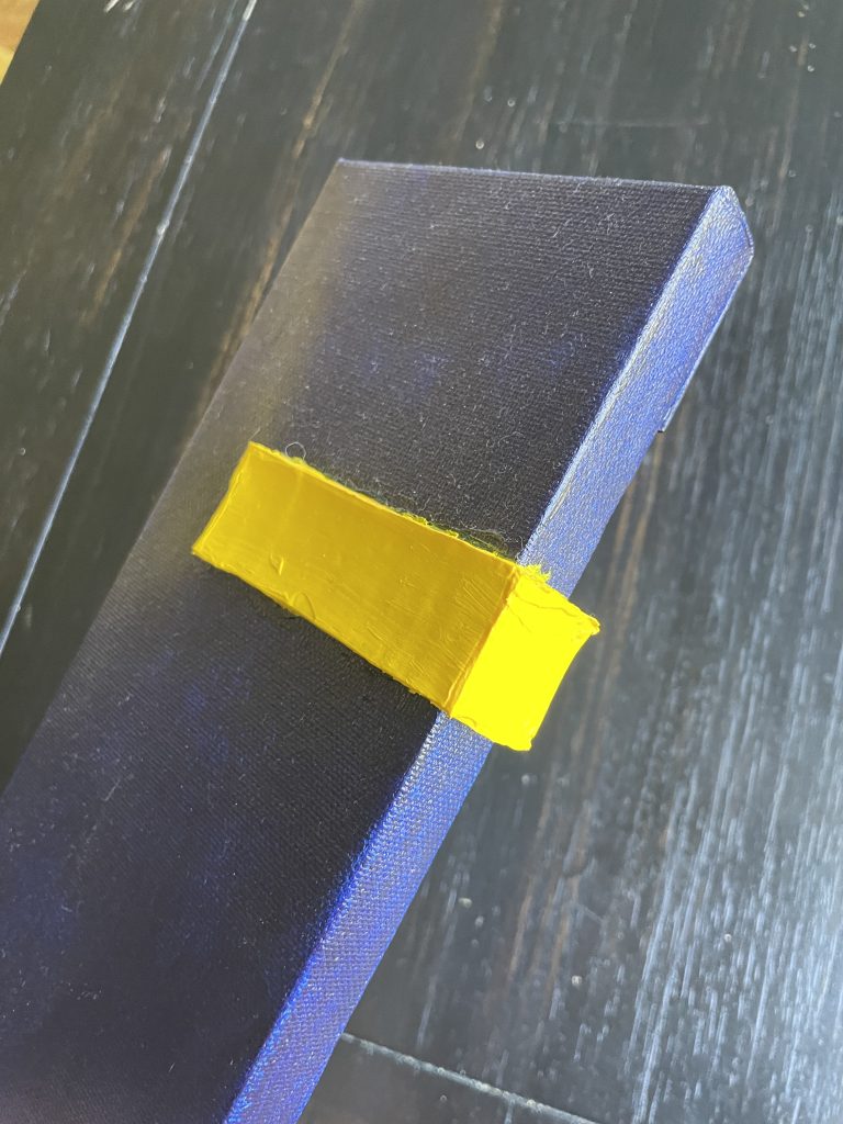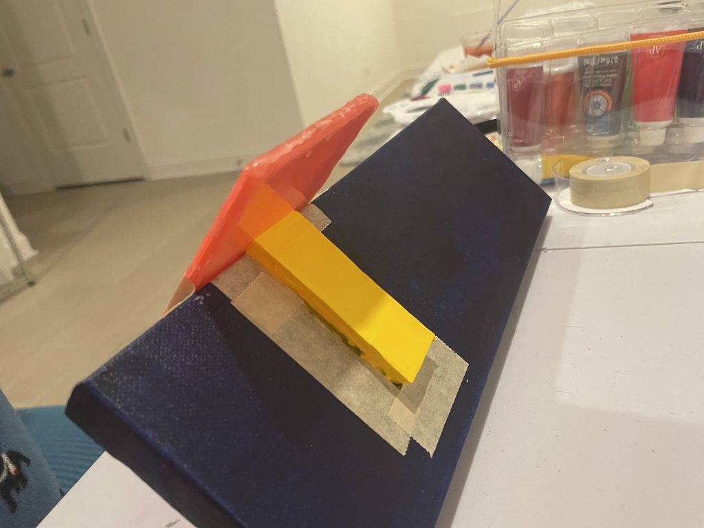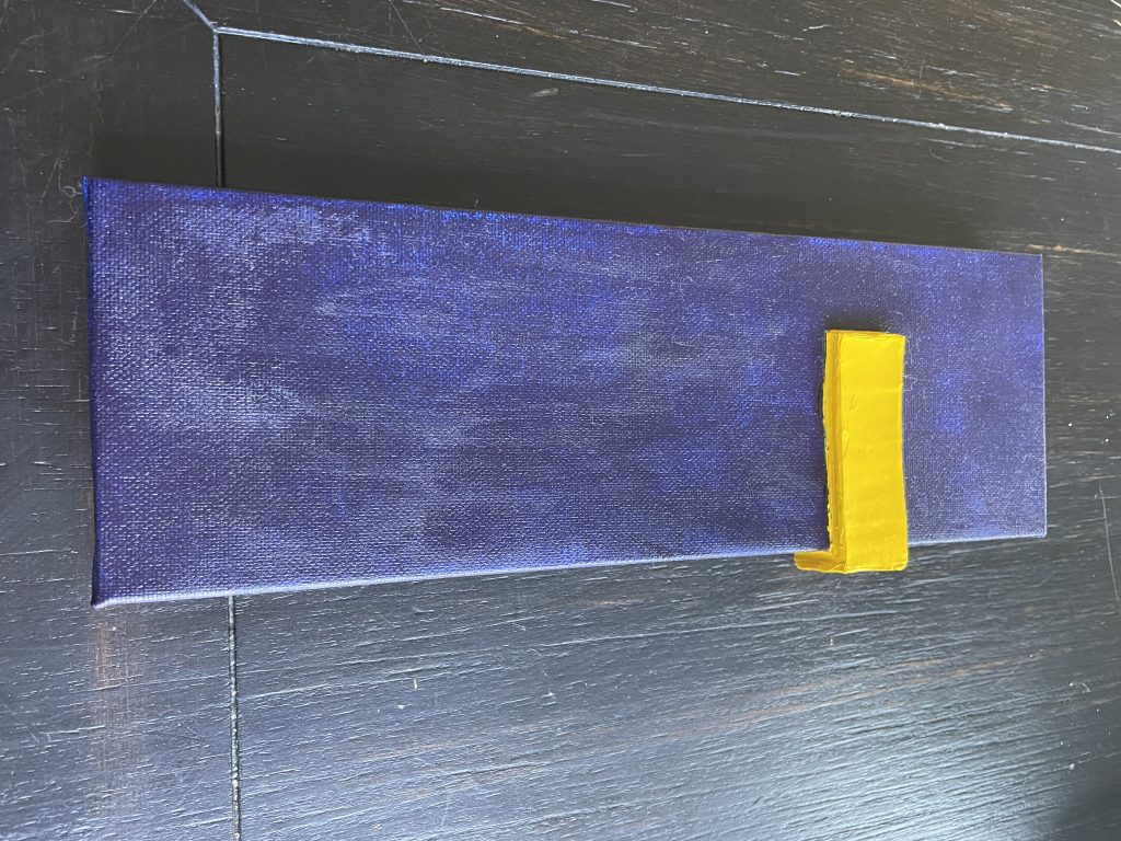 I’d successfully done several raised shapes, and was inspired by this slender canvas to try an experiment where the shape could go around the side of the canvas. I like the sides of the canvasses and have tried painting the edges different colors. I just saw a corporate painting in Chicago’s AON building where the edges were completely UNpainted and it looked pretty cool to me.