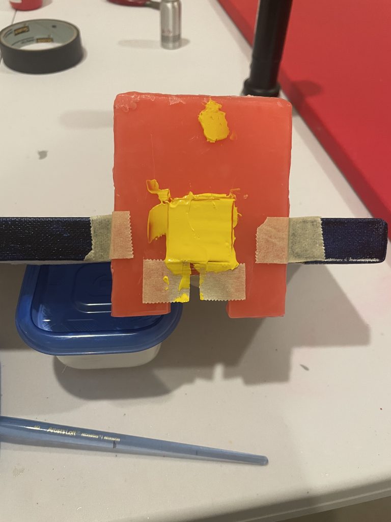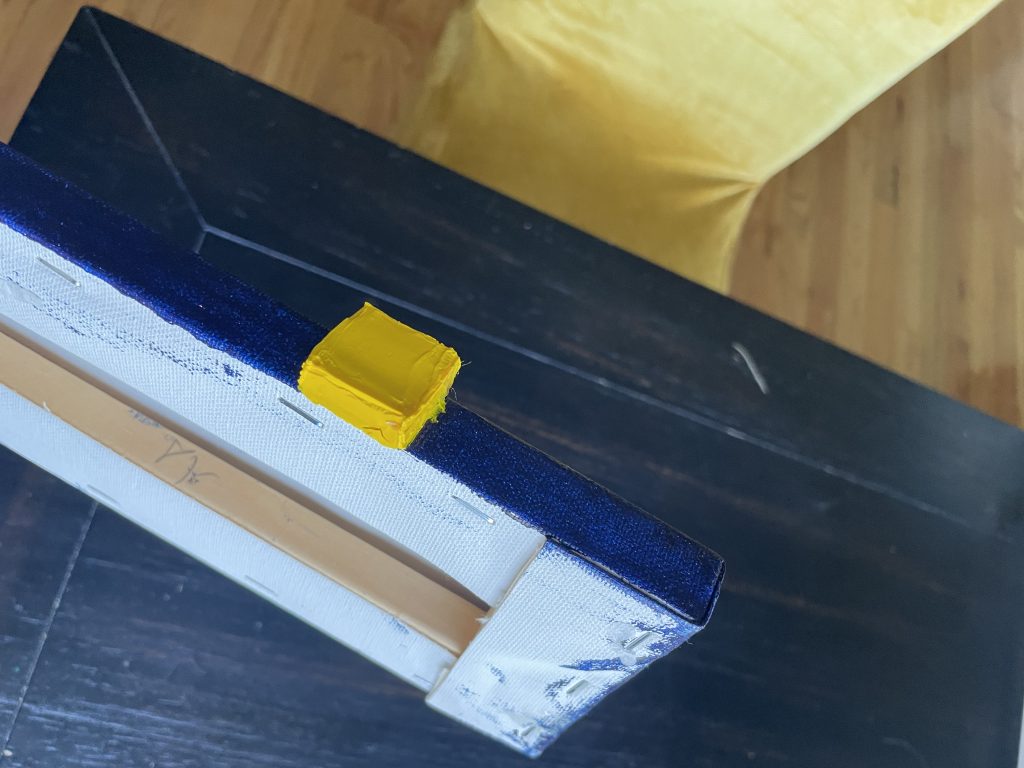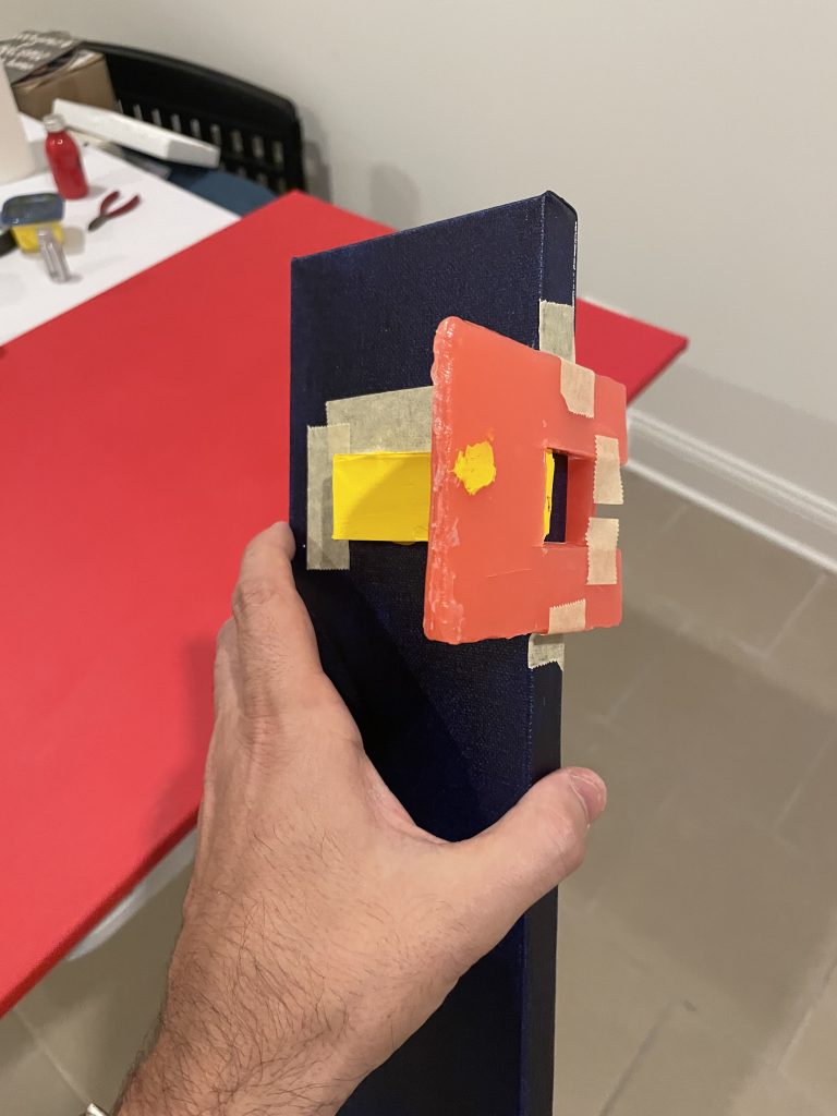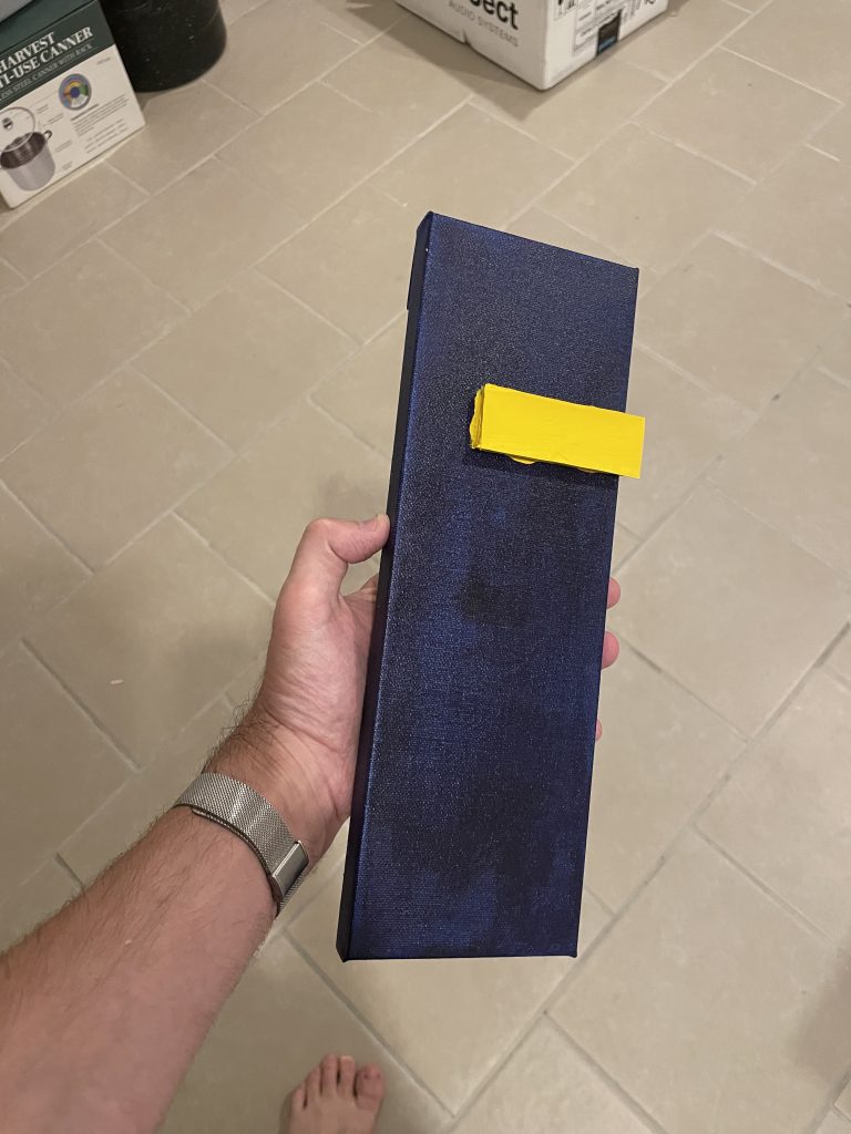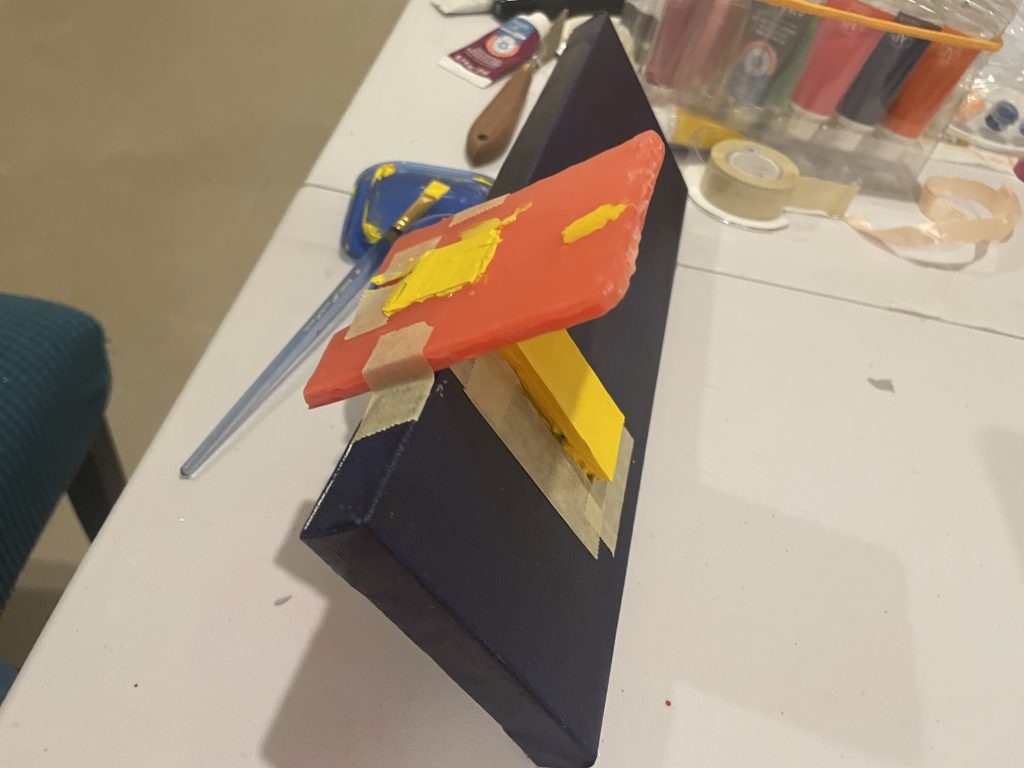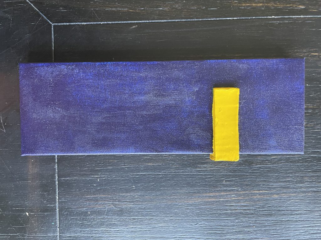 I’d successfully done several raised shapes, and was inspired by this slender canvas to try an experiment where the shape could go around the side of the canvas. I like the sides of the canvasses and have tried painting the edges different colors. I just saw a corporate painting in Chicago’s AON building where the edges were completely UNpainted and it looked pretty cool to me.