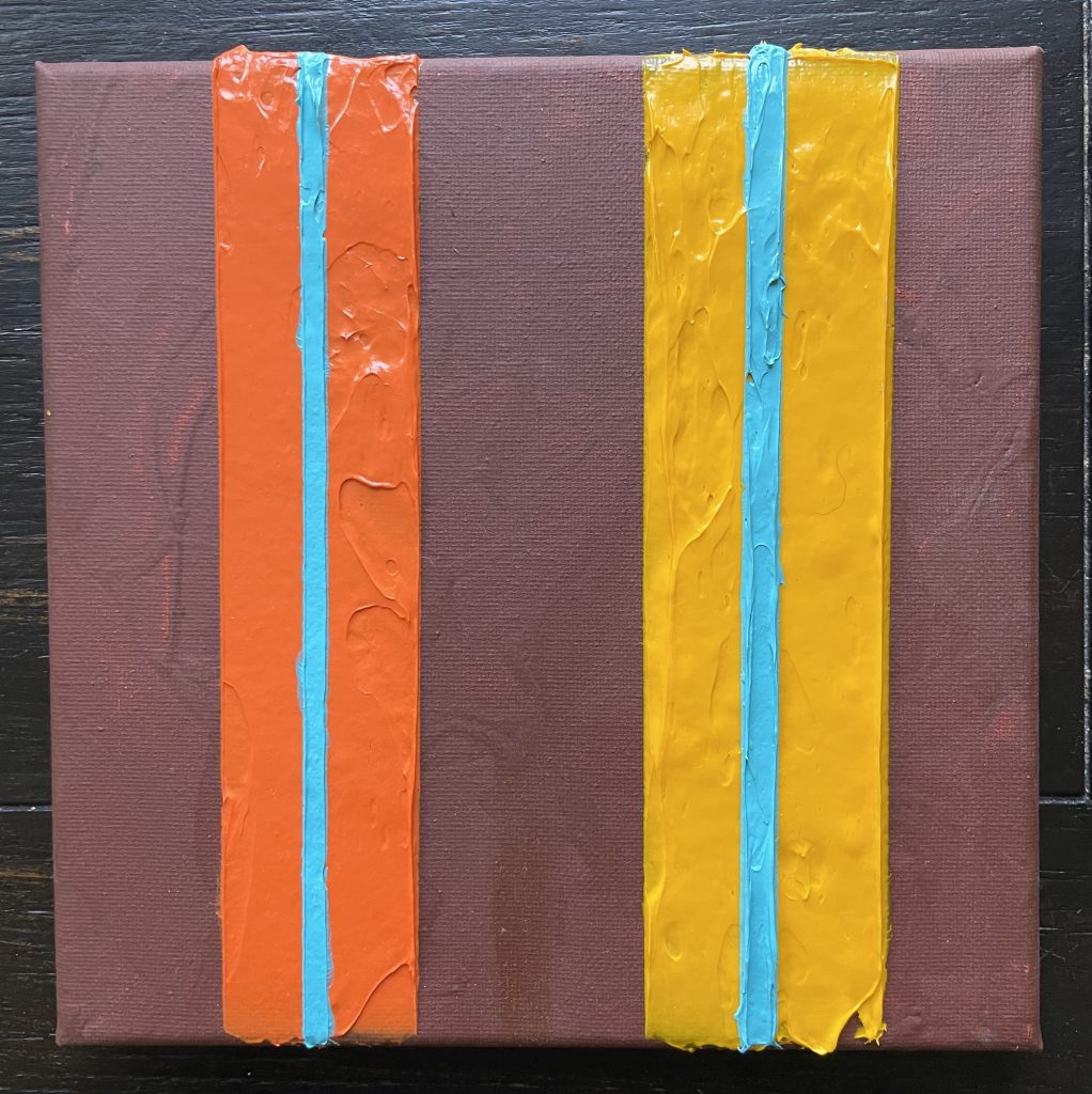 The technique of masking, laying down slabs of paint, and then pulling off the masking tape while the paint is still wet to get sharper edges was starting to feel more appealing. I still get 3D shapes, but I can get paintings done within a few days, even with an additional stripe on top like this one. It was also a bit of an optical illusion designed to vary the perception of width and colors.