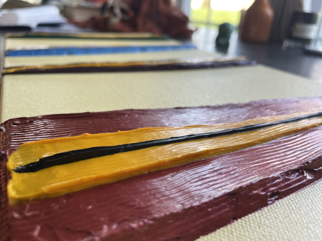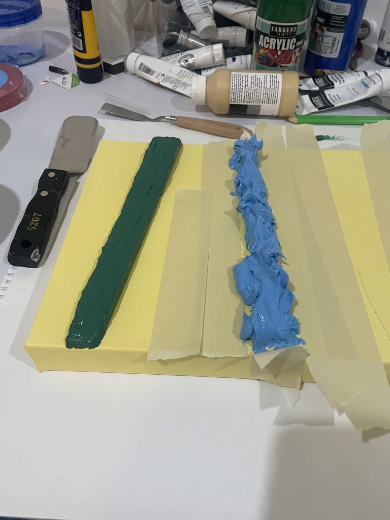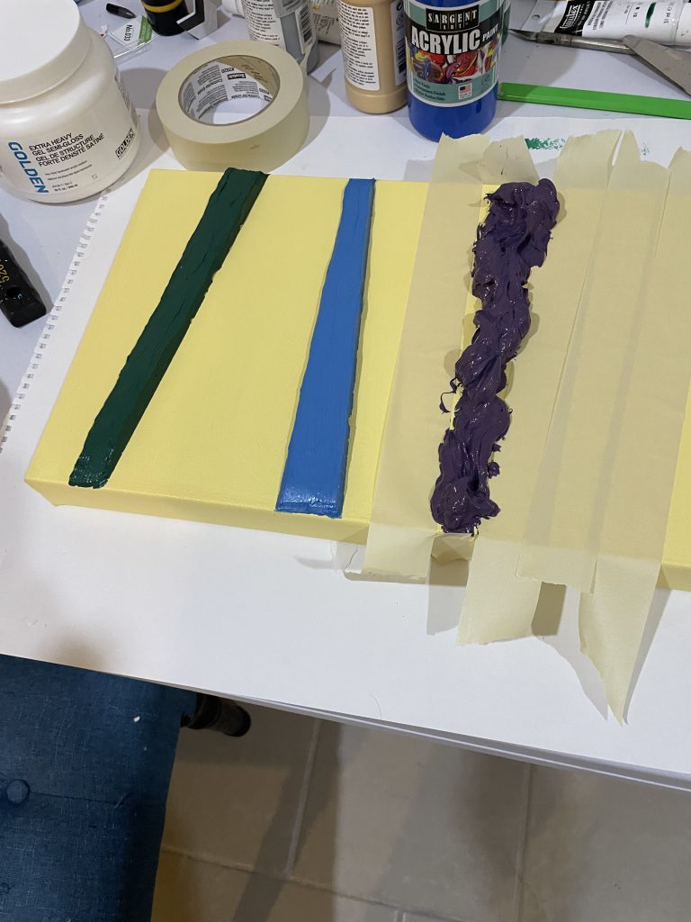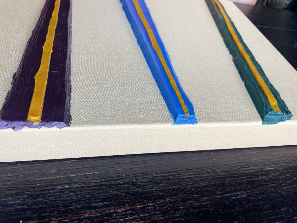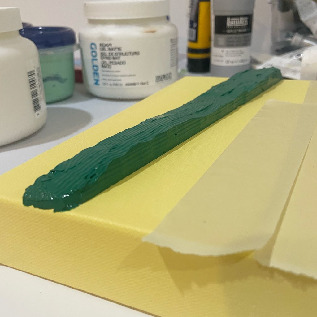 I specifically bought a much sturdier frame, reinforced in the middle, because thick slabs of paint can cause the canvas to bow and buckle. I’d been doing shapes without molds, using masking tape, and I wanted to experiment with using extremely thick slabs of paint.