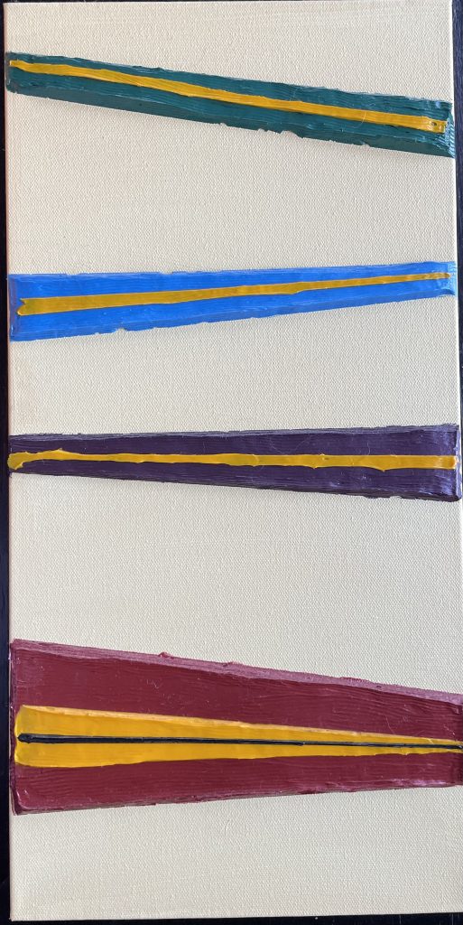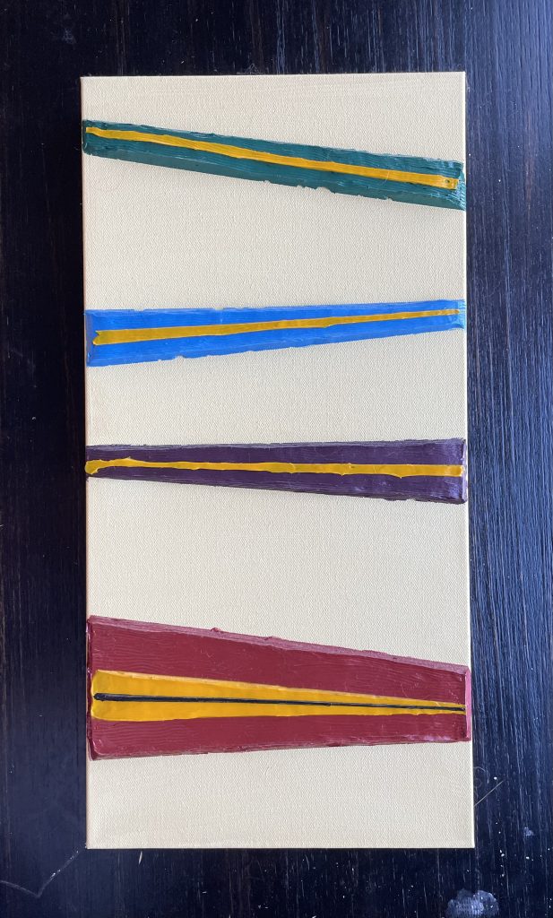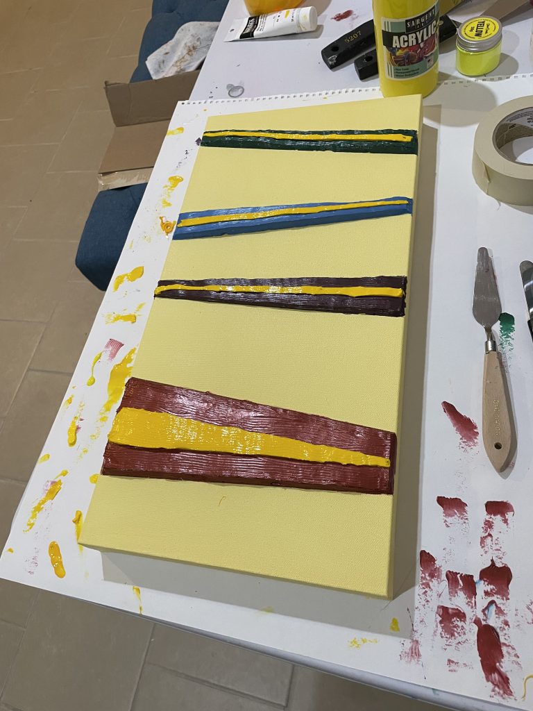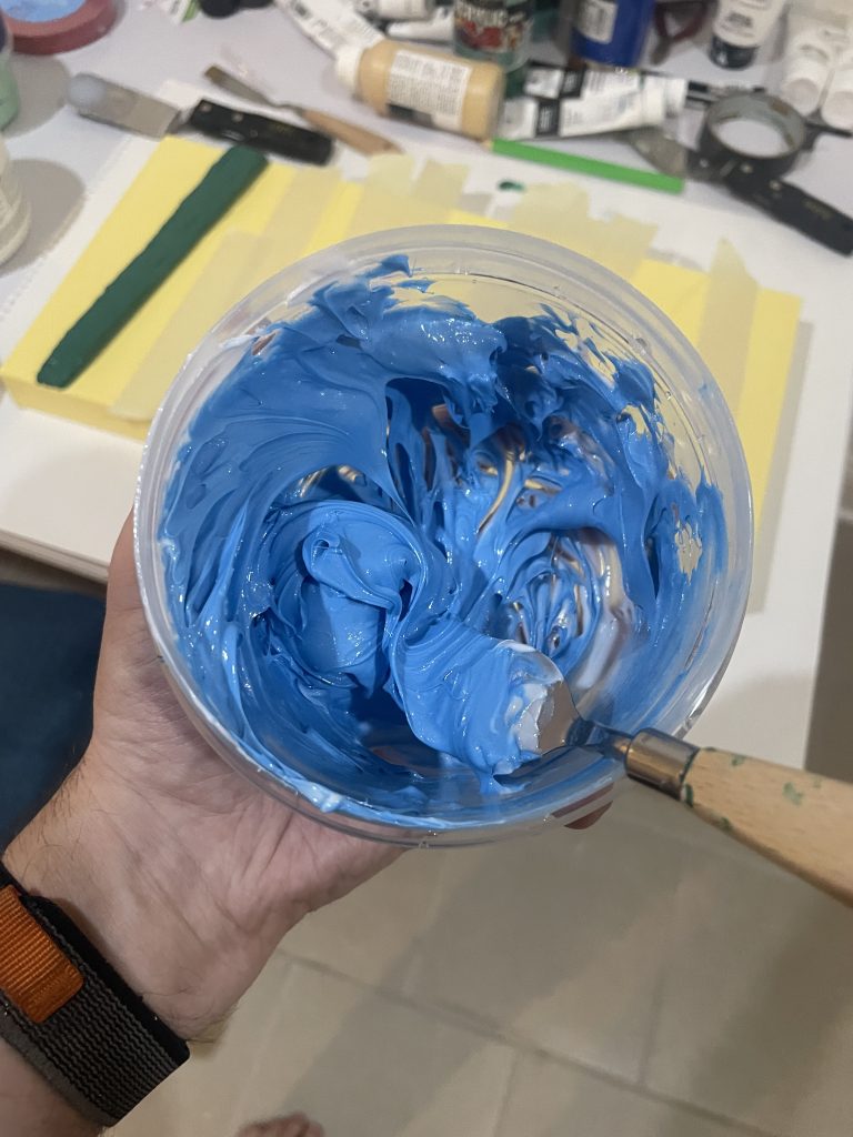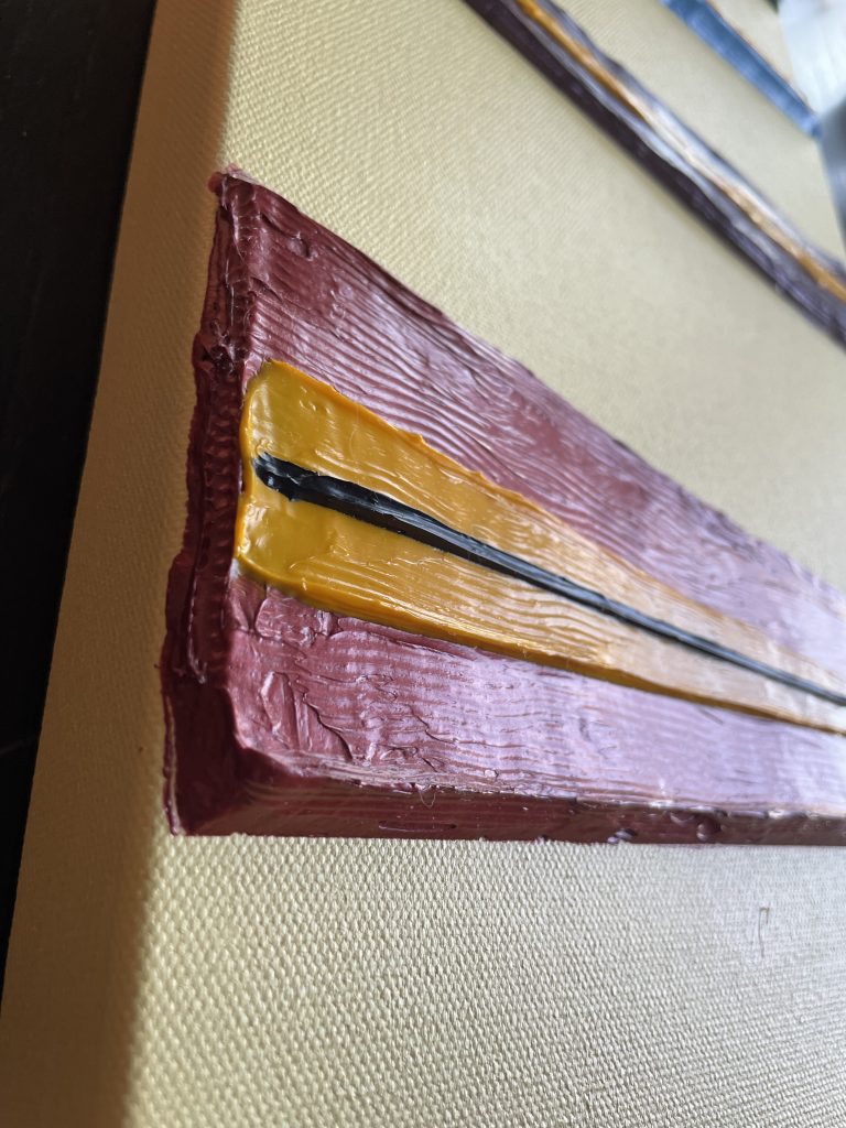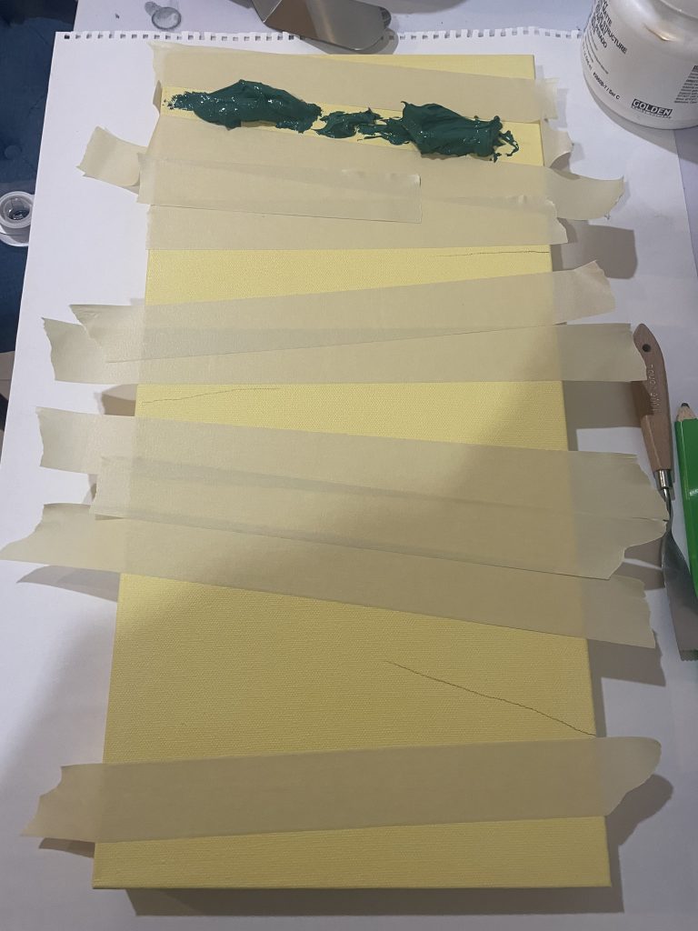 I specifically bought a much sturdier frame, reinforced in the middle, because thick slabs of paint can cause the canvas to bow and buckle. I’d been doing shapes without molds, using masking tape, and I wanted to experiment with using extremely thick slabs of paint.